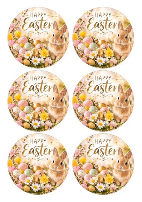Maak je taarten en desserts extra vrolijk met deze ronde eetbare Easter prints. De set bevat 6 eetbare prints van ongeveer 9 cm, perfect voor kleine taarten, mini cakes of grotere cupcakes tijdens Pasen.