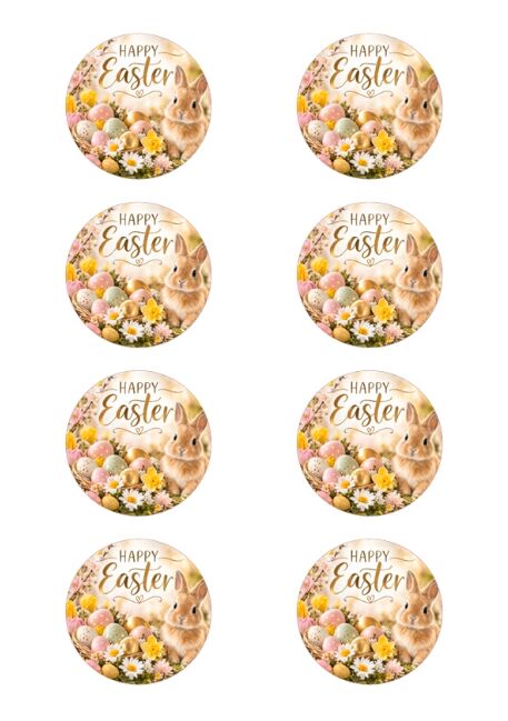 Geef je cupcakes, mini cakes en desserts een vrolijke paasuitstraling met deze ronde eetbare Easter prints. De set bevat 8 eetbare prints van ongeveer 8 cm, perfect voor het decoreren van cupcakes, kleine taartjes en andere paaslekkernijen.