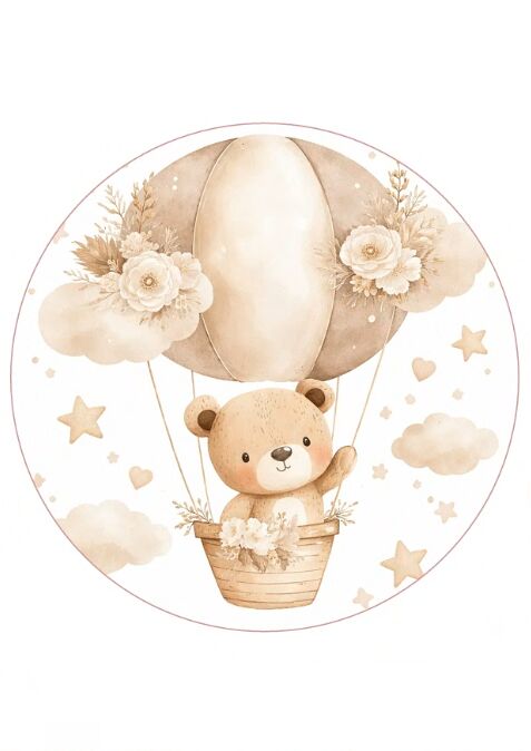 Maak je taart extra schattig en sfeervol met deze ronde eetbare Teddy Bear print van ongeveer 20 cm. Het design toont een lieve teddybeer in een speels en dromerig tafereel, perfect voor het creëren van een zachte en stijlvolle uitstraling op jouw taart.