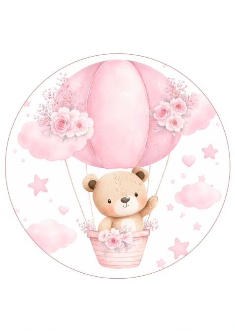 Maak je taart extra schattig en sfeervol met deze ronde eetbare Teddy Bear print van ongeveer 20 cm. Het design toont een lieve teddybeer in een speels en dromerig tafereel, perfect voor het creëren van een zachte en stijlvolle uitstraling op jouw taart.