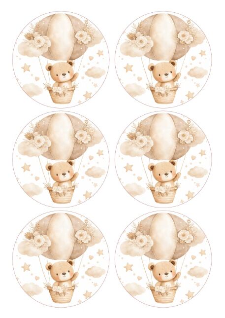 Maak je taarten en desserts extra schattig met deze ronde eetbare Teddy Bear prints. De set bevat 6 eetbare prints van ongeveer 9 cm, ideaal voor kleine taarten, mini cakes en grotere cupcakes.