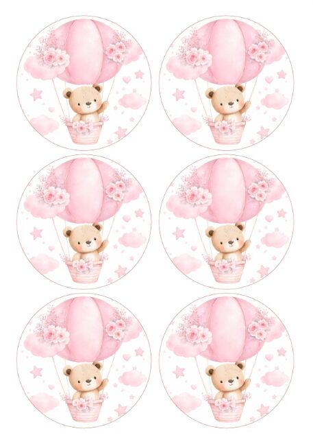 Maak je taarten en desserts extra schattig met deze ronde eetbare Teddy Bear prints. De set bevat 6 eetbare prints van ongeveer 9 cm, ideaal voor kleine taarten, mini cakes en grotere cupcakes.