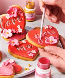 Met de FunCakes Metallic Food Paint Gold kun je prachtige effecten creëren op fondant, marsepein, gum paste, royal icing en meer. De verf is gemakkelijk te gebruiken, schud voor gebruik en breng dan eenvoudig aan met een kwast op het oppervlak. De goude verf is 100% eetbaar en droogt goed en plakt niet na het aanbrengen.